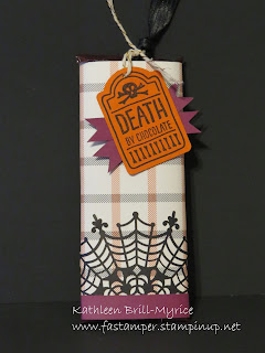 I first wrapped the chocolate bar with another piece (5-1/2" x 5-1/2") from the Happy Haunting Designer Series Paper. The new Tear and Tape adhesive is wonderful for holding bent papers closed. This is the other half of the Spider Web Doily from yesterday's project. I then layered a 1/2" strip of Rich Razzleberry on the bottom and put a couple pieces behind the Tangerine Tango tag piece. (Exciting New Product Coming--The black ink is a new Archival Black Ink Pad. Stamps a true black color for those who have been getting a purple tint from our standard Basic Black Classic Ink Pad). There is a long piece of Black Stitched Satin Ribbon that loops around the candy bar to pull it out of the sleeve.